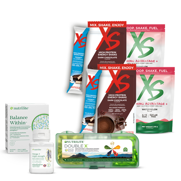 3 Ως αποτέλεσμα ενός πιο υγιεινού τρόπου ζωής και τακτικής άσκησης. Επιπλέον, η XS™ High Protein Energy Bar και το XS™ High Protein Energy Shake έχουν υψηλή περιεκτικότητα σε πρωτεΐνη. Το XS™ Amino Advantage + περιέχει μείγμα και των 9 απαραίτητων αμινοξέων που ο οργανισμός σας δεν μπορεί να παράγει από μόνος του. Τα αμινοξέα είναι τα δομικά στοιχεία της πρωτεΐνης. Η πρωτεΐνη συμβάλλει στη διατήρηση και ανάπτυξη της μυϊκής μάζας.